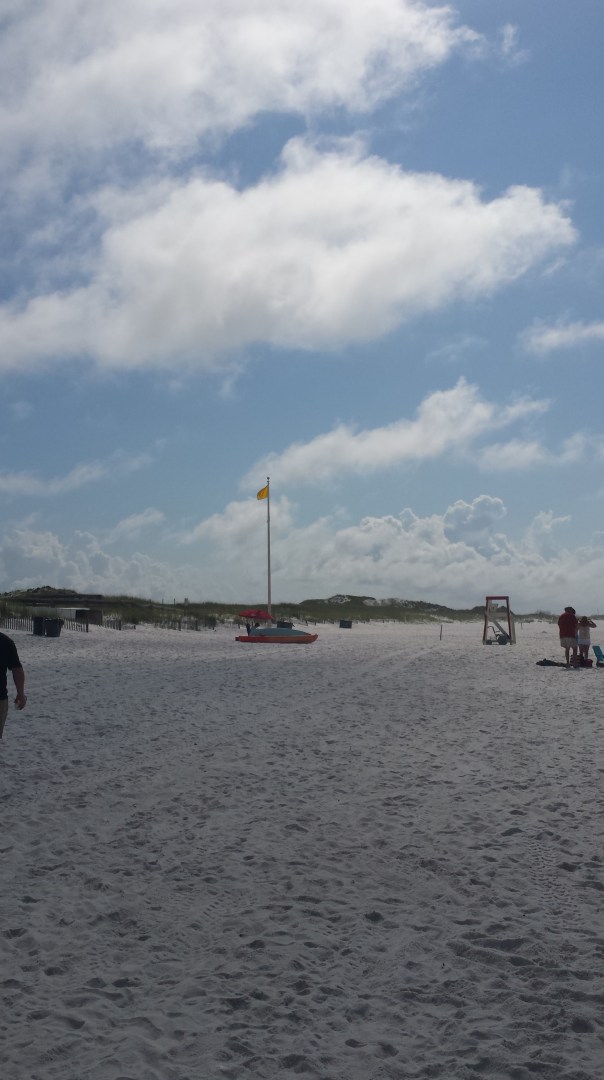 Okaloosa Island Beasley Park is pretty clear with just a few tiny bits of June grass. I’m going to call it a 0.25 on the Index. Flags are yellow, the surf is a little rough, and the water is a nice temperature.