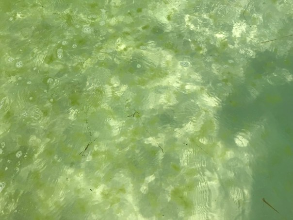 “Ugly today. Visibility in water is less than 6 inches. Junegrass out to second sandbar. Residual Junegrass from last night scattered along shore. On a positive note. Plenty of parking and Sunshine. 6/15/19